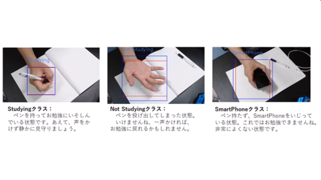 画像認識でペンを持っている「Studyingクラス」、ペンを投げ出してサボっている「Not Studyingクラス」、ペンすら持たずスマホをいじってサボっている「SmartPhoneクラス」を認識してそれに応じた対応を行なっています。