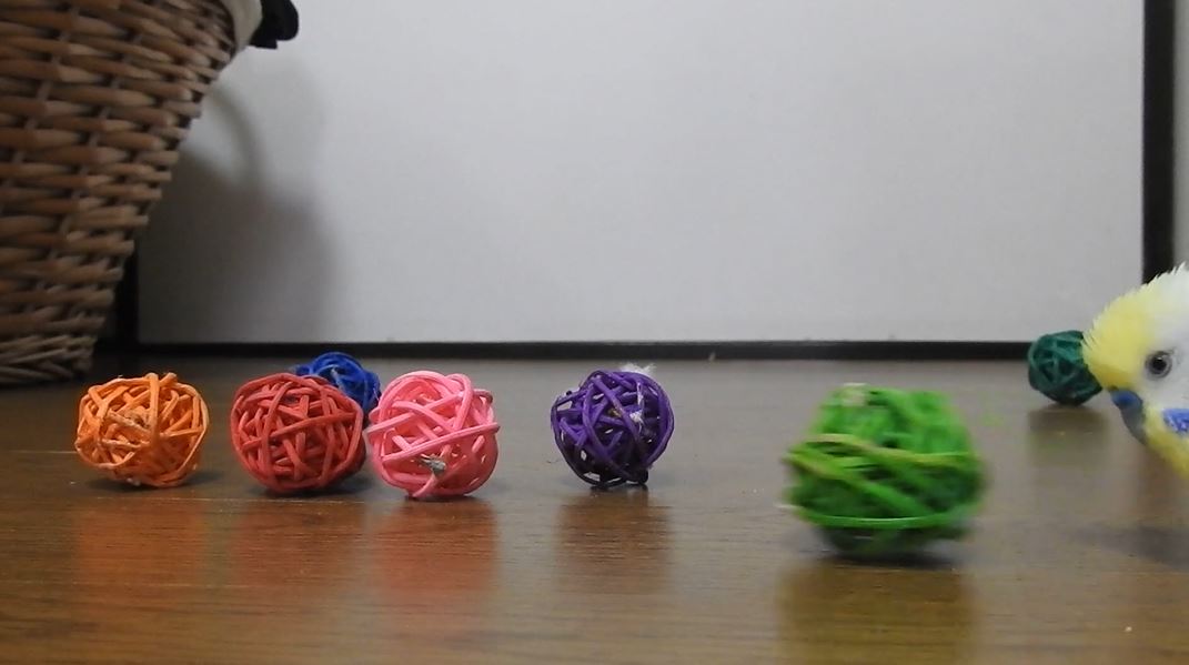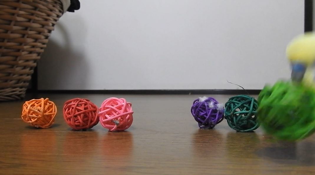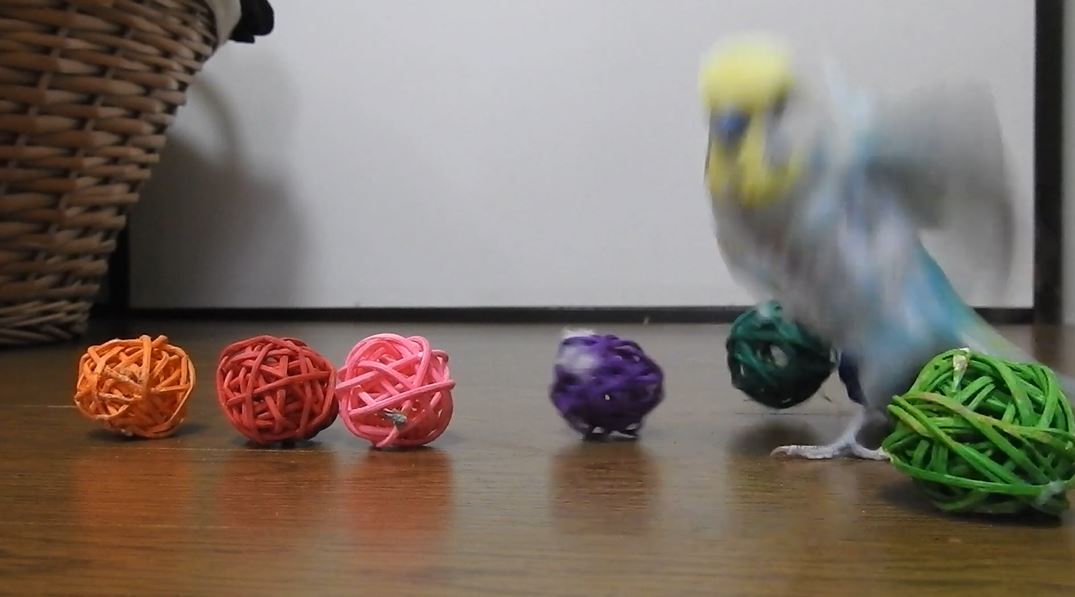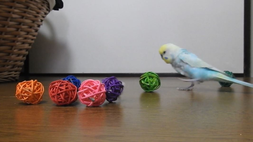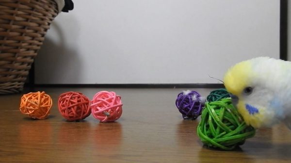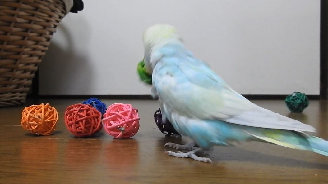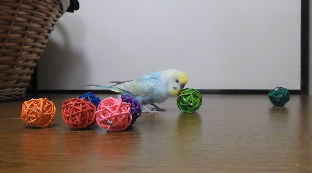 緑色が無い時には見向きもしませんでしたが、緑色のボールが来てからずっと遊んでいるインコちゃん。本当にお気に入りなのですね。