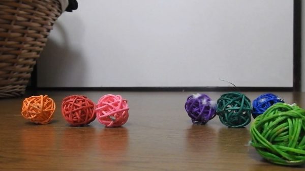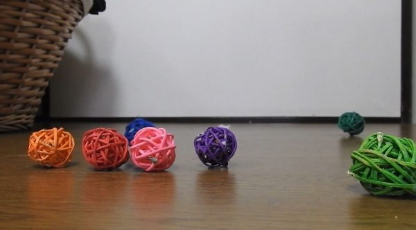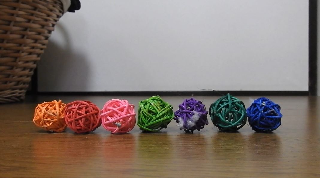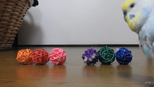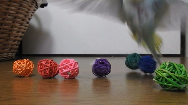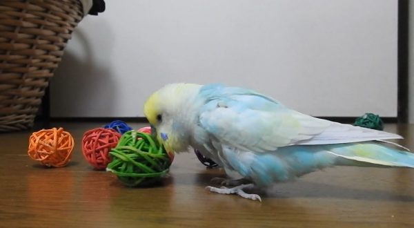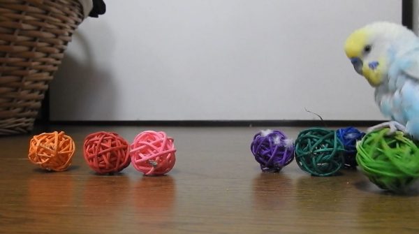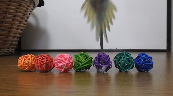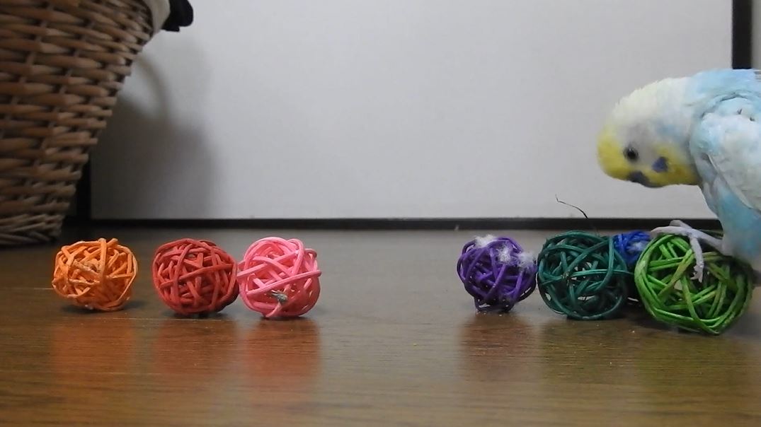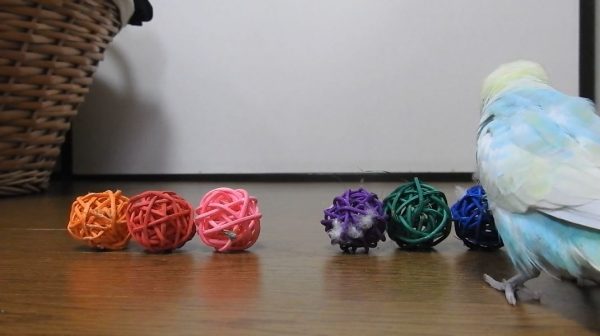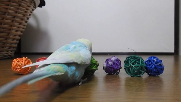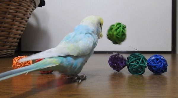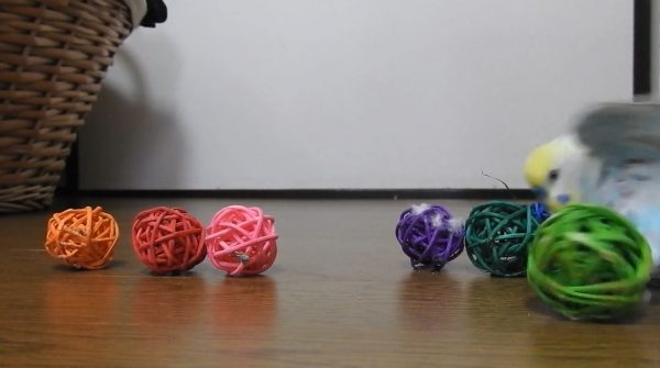 緑色が無い時には見向きもしませんでしたが、緑色のボールが来てからずっと遊んでいるインコちゃん。本当にお気に入りなのですね。