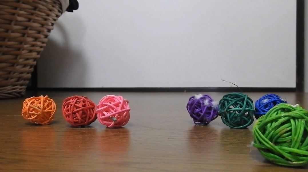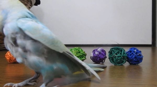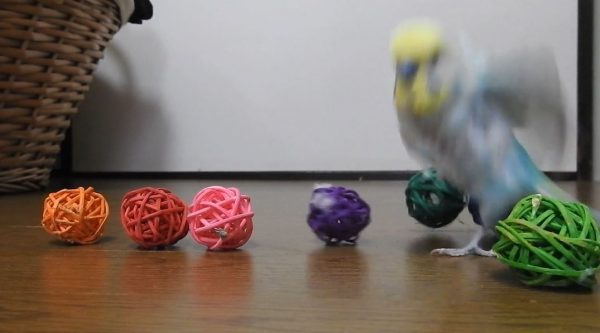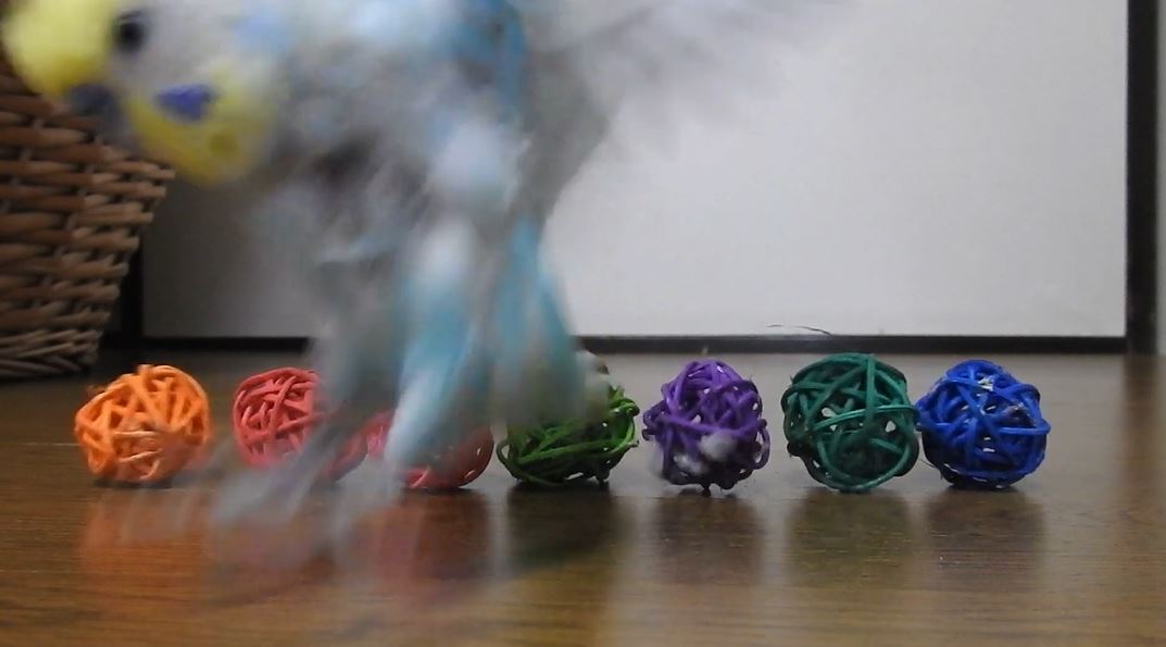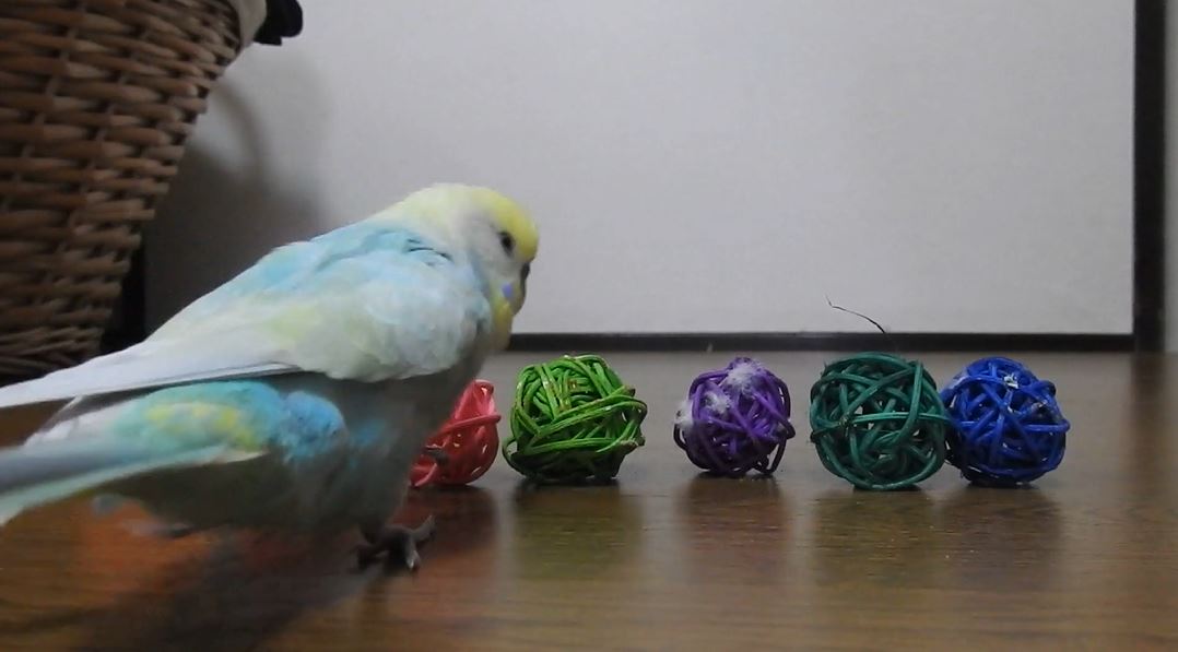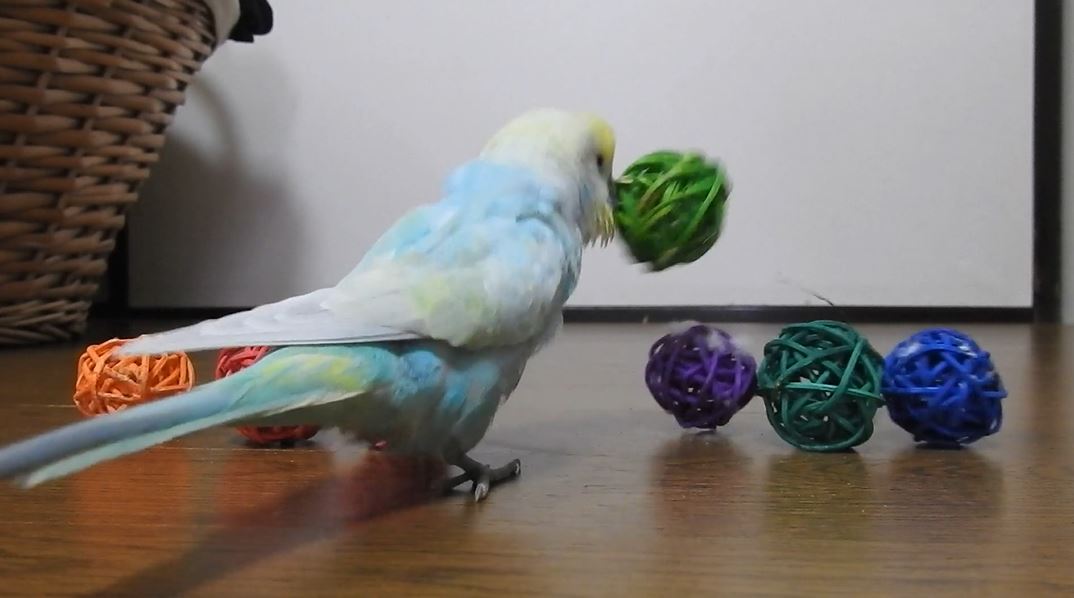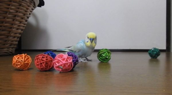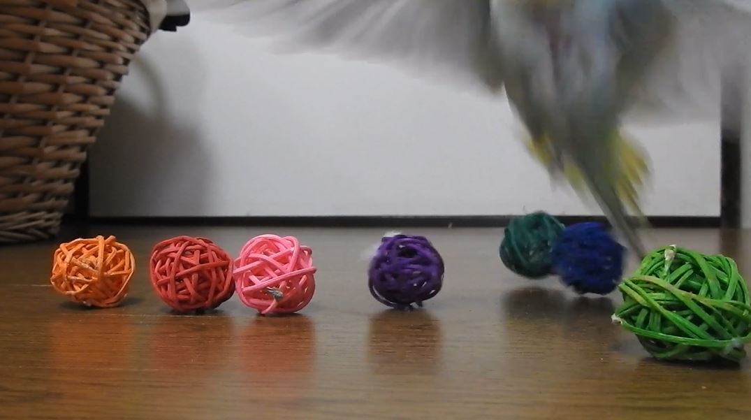 緑色のボールが好きすぎるインコちゃん! カラフルなボールが沢山並ぶ中、緑だけを追いかけ遊ぶ姿が微笑ましい