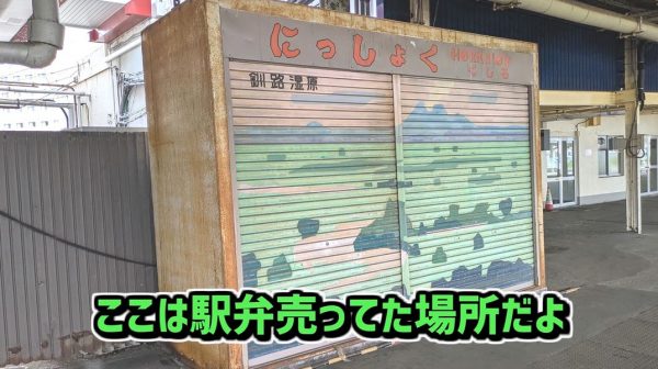 ホームには駅弁を打っていた場所が。シャッターには釧路湿原が描かれています。