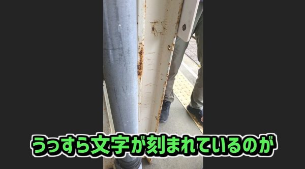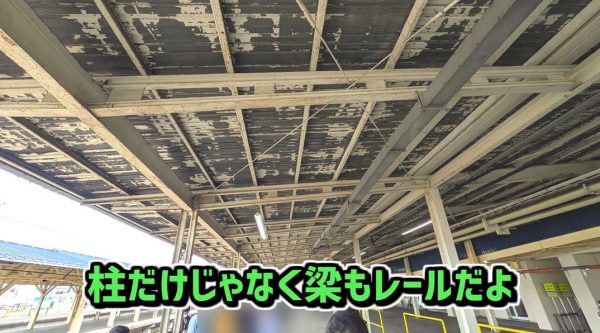 ホームで教わったのは柱の秘密。うっすら文字が刻まれています。これは使われなくなったレールを再利用したものだとか。
