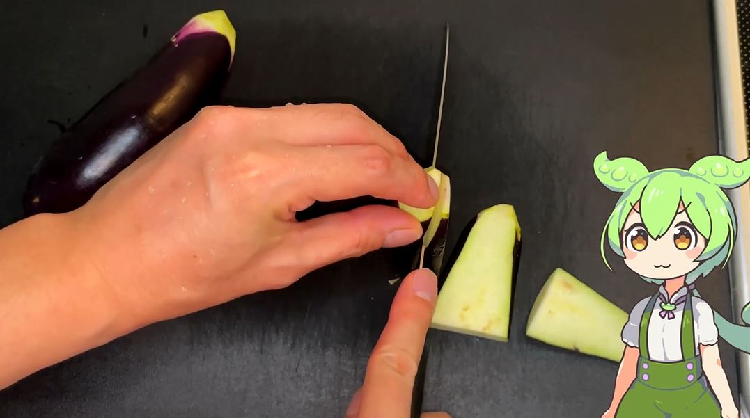 まずはナスをカット。長さを半分にしてから縦に薄切りにしました。
