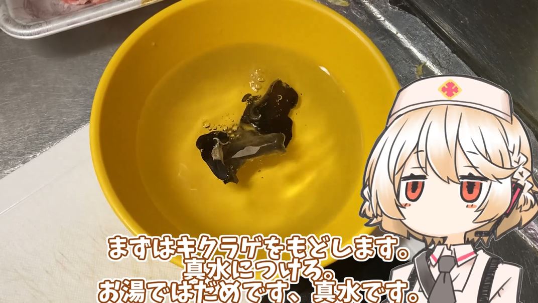 まずはキクラゲをもどします。お湯ではなく真水に漬けて戻すのがポイントとのこと。食感がよくなり、プリッとした歯触りになるのだとか。戻した後は食べやすいサイズにカットします。
