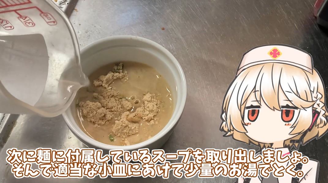次は付属のスープを取り出し、適当な小皿に入れたら少量のお湯で溶いておきます。
