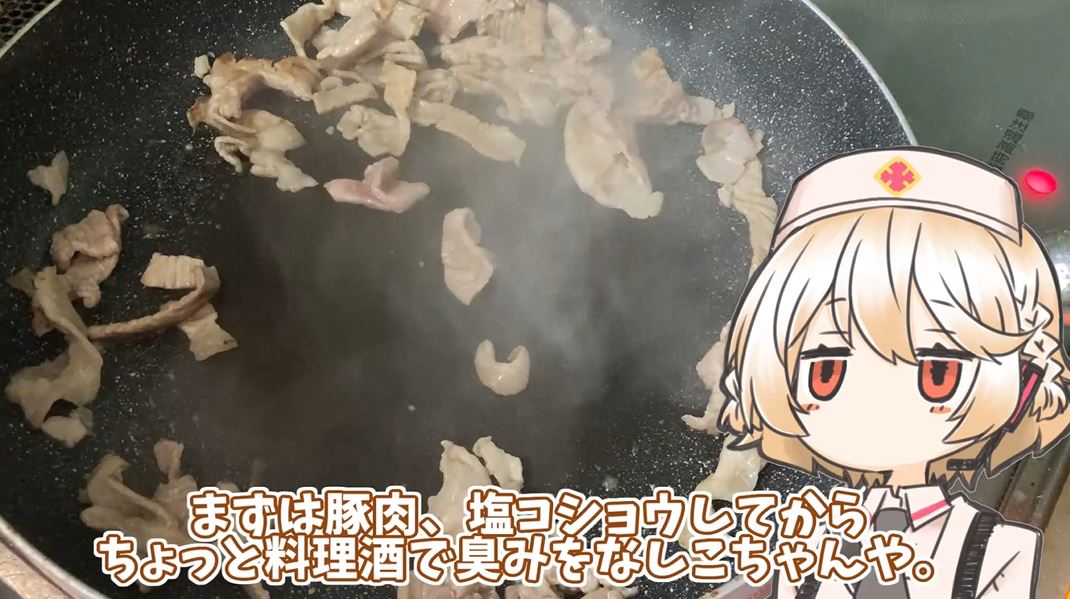 続いては焼きの工程です。フライパンにマルタイ付属の調味油を入れ、豚肉に塩コショウをして軽く炒めたところへ料理酒を投入。肉の臭みを消します。