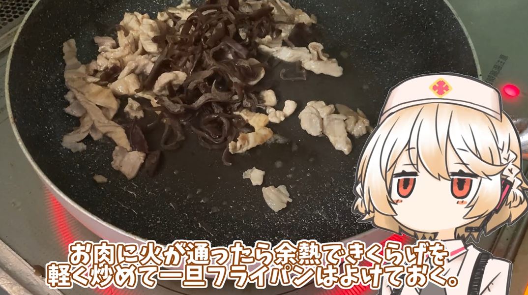 肉に火が通ったら余熱できくらげを軽く炒め、いったんフライパンをよけました。
