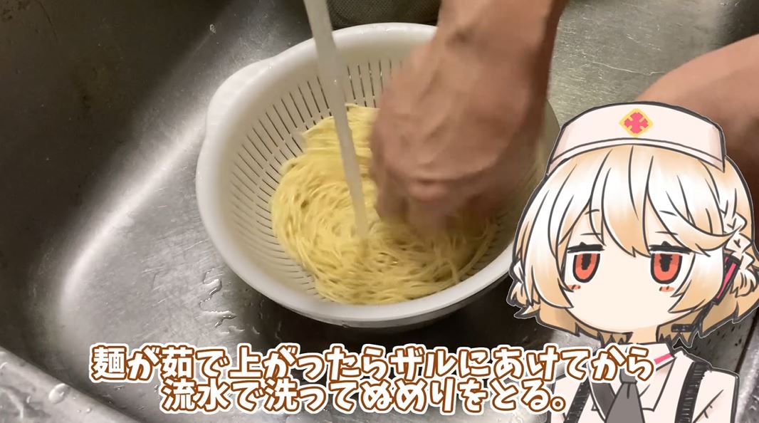 あとはラーメンを茹でるのですが、このあと焼くので茹で時間は通常より30秒から1分短め。茹で上がった麺はザルにあけて流水でぬめりを取ります。より丁寧にするならば、一度氷で締めるといいそうです。