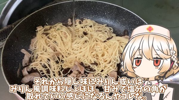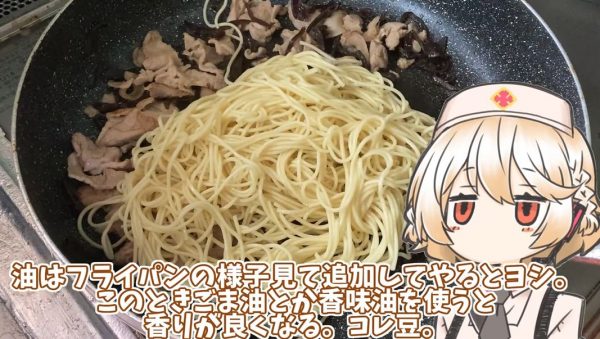 ふたたびフライパンを火にかけたら、フライパンの状態に合わせて油を追加してから茹で麺を投入。このときの油はゴマ油などの香味油がオススメと物体Bさん。