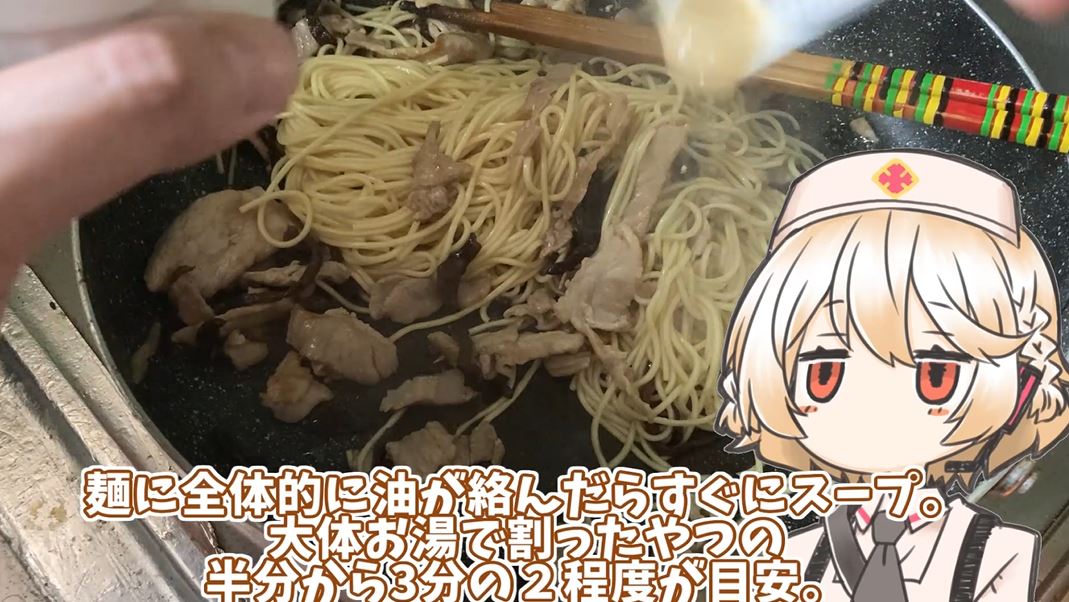 麺へ全体的に油が絡んだらすぐに作っておいたスープで味付け。半分から2/3が目安だそう。