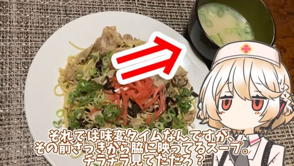 次は味変。これは味付け時に残ったスープにお湯とネギを加えたものを使います。