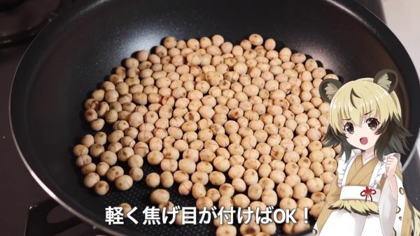 まず、フライパンで大豆を煎ります。表面の皮が割れて軽く焦げ目がついたらOK。鍋に移してお湯を注ぎ、沸騰したら火を止めて、そのまま翌朝まで置いておきます。