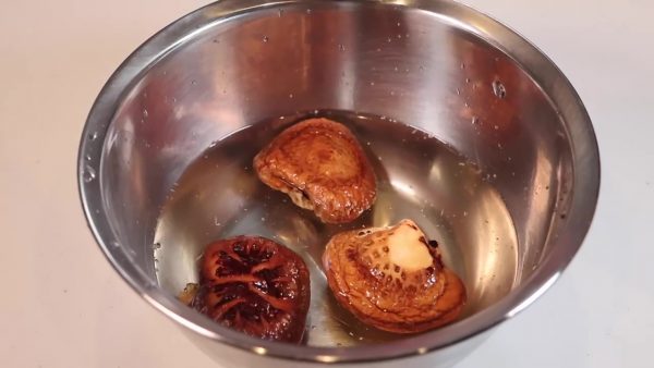 干し椎茸は一度水で洗い、水に浸して冷蔵庫で一晩置きます。ヒダが下になるようにすると、旨味がよく出ます。
