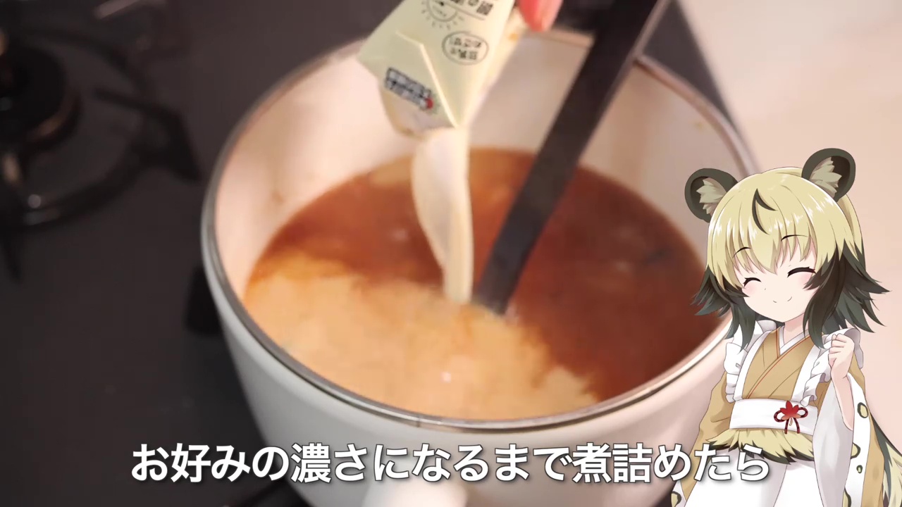 スープを仕上げます。3分の1まで濃縮したお出汁に、練りごまと焦がし味噌を加えます。最後に豆乳でのばし、お好みの濃さになるまで煮詰めたら、濃厚スープの完成です。