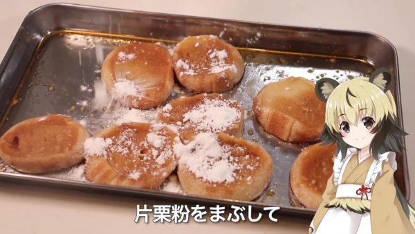あとは片栗粉をまぶして揚げていきます。少し焦げてしまいましたが、焦げるギリギリが一番おいしいそうです。余った油でナスを揚げます。