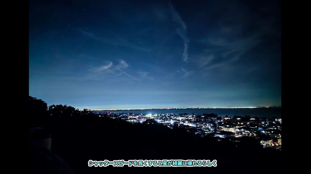 真っ暗な公園にいるので星空の写真にも挑戦。シャッタースピードを遅くすることで星が綺麗に映っています。スマホでここまで撮れたとのこと、驚きですね。