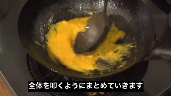 火が通ると徐々に固まってくるので、全体を叩くようにまとめていきます。