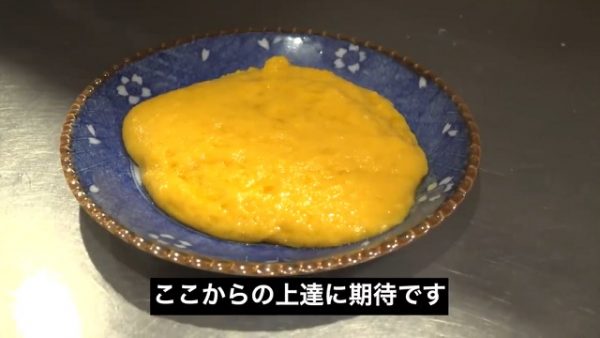 ついに完成! とても細かく叩いて混ぜていましたが、少し粗さが目立つそうです。さすが激ムズ料理。特訓あるのみですね。