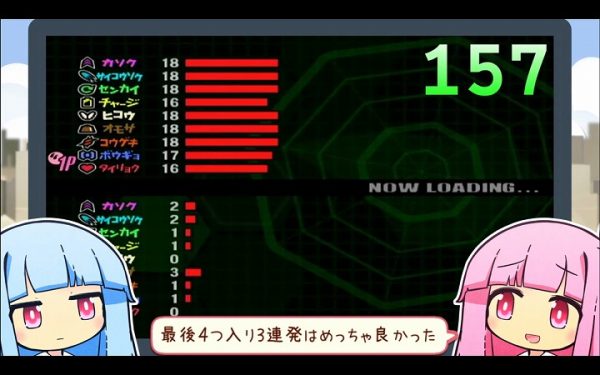 140以上まで性能を伸ばす回も当たり前となり、動画中盤では全性能MAXの挑戦では定番となる城のシャッターイベントなしでも157/160というクリア目前まで迫ることもあった。