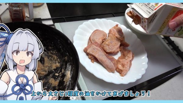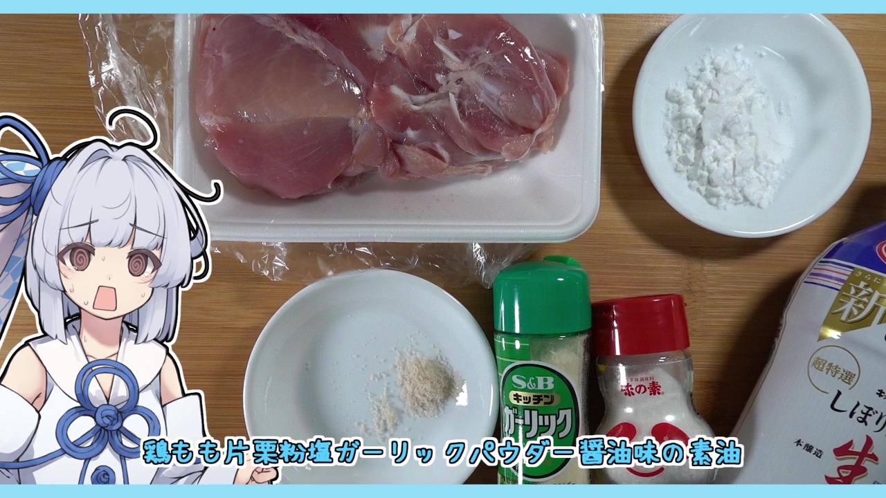 動画では、葵ちゃんが「油で揚げない唐揚げとかいうの見かけたのでやってみます」と調理をスタート。材料は鶏もも肉のほか、塩、ガーリックパウダー、醤油、味の素、片栗粉です。
