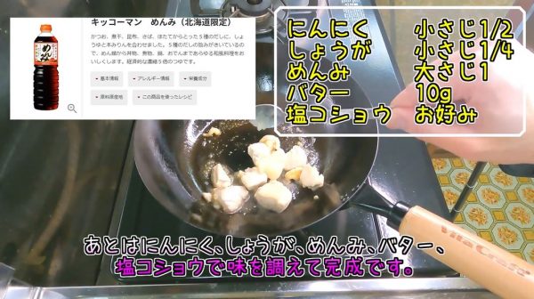 あとはニンニクとショウガとめんみとバターと塩コショウで味を調えます。めんみは5倍濃縮のつゆです。