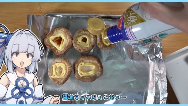 アルミホイルへシイタケを並べ、マヨネーズをくるくるした後は醤油をちょこっと垂らします。