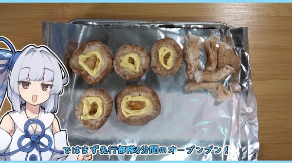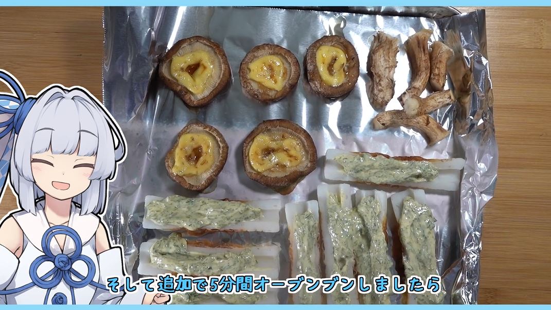 シイタケのアルミホイルへ半分にカットしたちくわも並べ、凹みに青のりマヨを入れたら追加で5分オーブンで焼きます。
