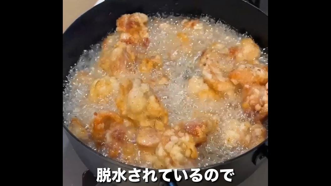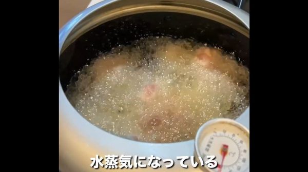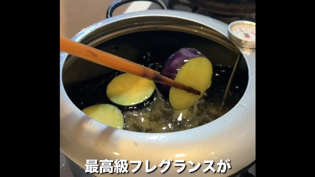 揚げ物の際に出てくる泡は食材から出てきた水蒸気。このとき食材は脱水されているわけです。マツタケも例外ではなく水分が抜けるのですが、このとき水分の代わりに空気が入り込み、マツタケの最高級フレグランスが閉じ込められるのだか。