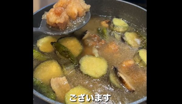 今回のお料理は揚げただけでは終わらせない、ととっくんさん。なんとみぞれ煮にするそうです。マツタケとは関係の無い食材の下ごしらえが続いていたのはみぞれ煮のためだったのですね。