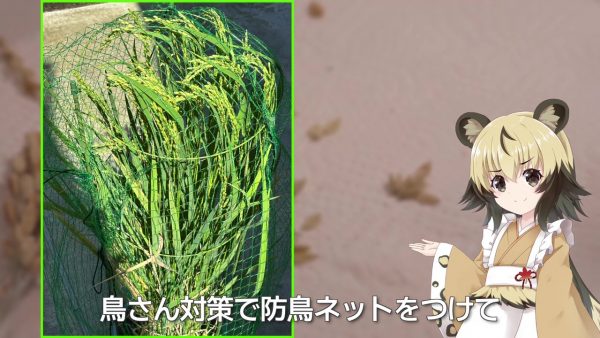 穂ができたら、防鳥ネットをかぶせます。黄金色に実った稲穂を刈り取り、2週間ほど「かさがけ」して乾燥させます。収穫までの期間は、なんと約5〜6カ月。ほぼ半年がかかっています。