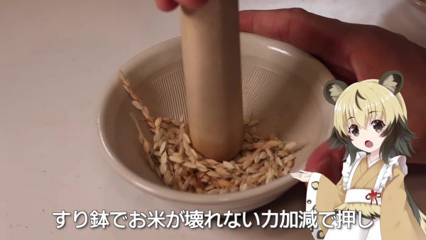 次に、すり鉢で米が壊れない程度の力加減で押し、もみ殻をはずします。こうすると玄米になります。この時点で重さを測ってみると25グラム。中にお米が入っていないもみも多く、思った以上に厳しい結果になりました。