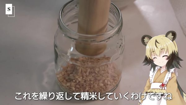 玄米を瓶に入れ、やさしく棒で突きます。これを繰り返して精米をします。この量では力加減が難しいので、軽く2分づきくらいにしました。