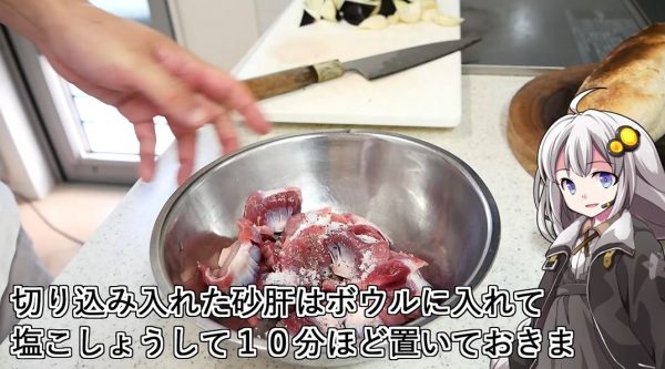 硬い砂肝は切り込みを沢山入れることで食べやすくしました。塩コショウをして軽く混ぜ、10分ほど置いておきます。