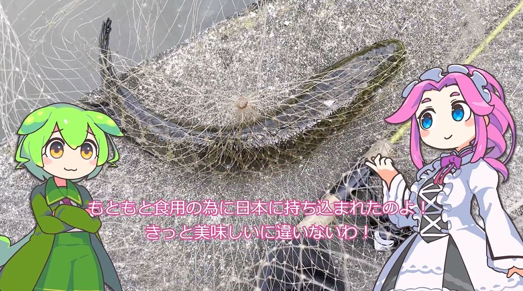 釣り上げたのはライギョ。もともと食用として日本に持ち込まれた外来魚です。何度か見かけてはいるけれど、ふわふわなエビさんも釣るのは初めてとのこと。ライギョの他の川や池への移植は禁止されていますが、生きたまま持ち帰るのはセーフなのでそのまま持ち帰ります。淡水魚は死んでしまうと臭みが出るのだとか。