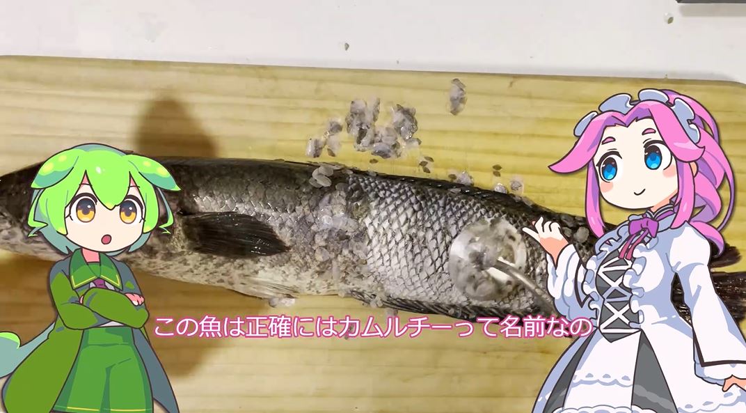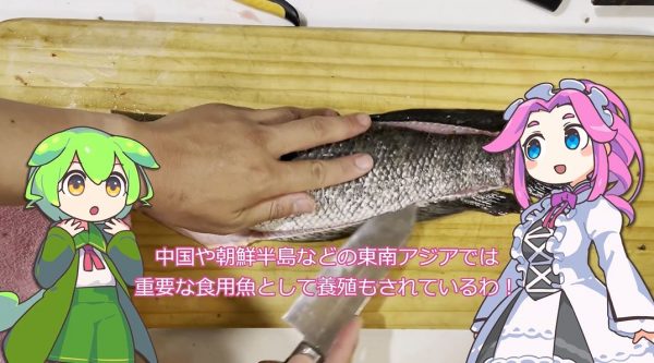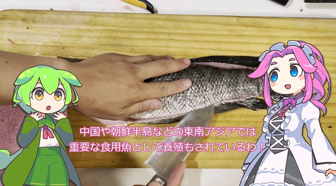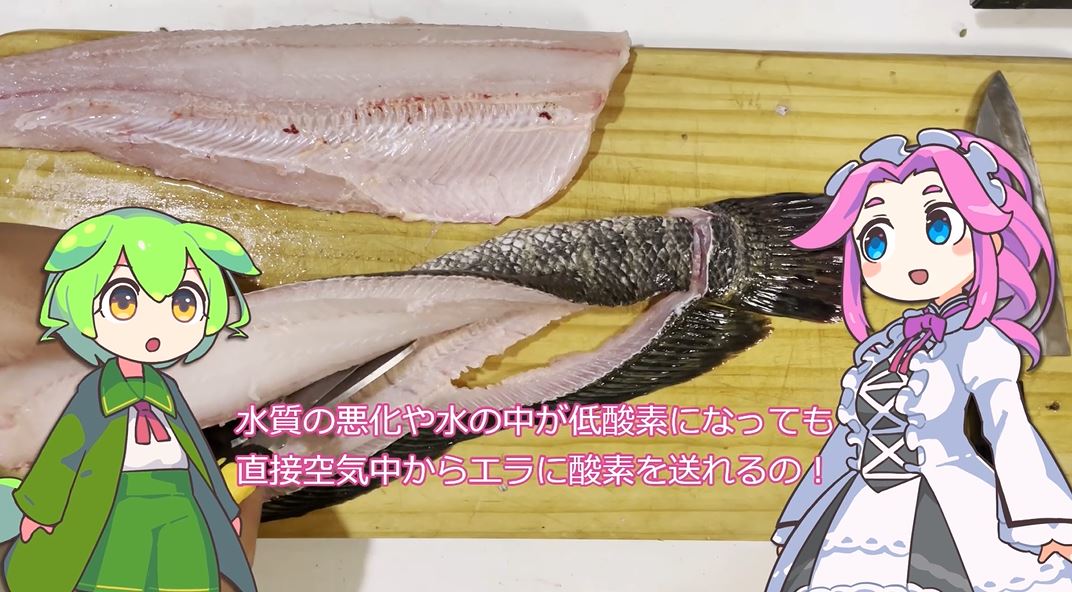 三枚におろしながら解説をはじめたふわふわなエビさんによると、この魚の正式名称はカムルチー。ライギョはタイワンドジョウ科の総称なのだそうです。水質の悪化や水の中が低酸素になっても直接空気中からエラに酸素を送れるので、水量の変化が激しい用水路でも生きていけるとのこと。冬場は泥の中に潜って冬眠したりもするとか。