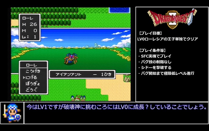 バグ技も使って『ドラゴンクエストII 悪霊の神々』のLv0主人公単独クリアを実現する本シリーズ。中盤以降はバグを多用したプレイになるという本縛りではどのようなプレイが見られるのだろうか?