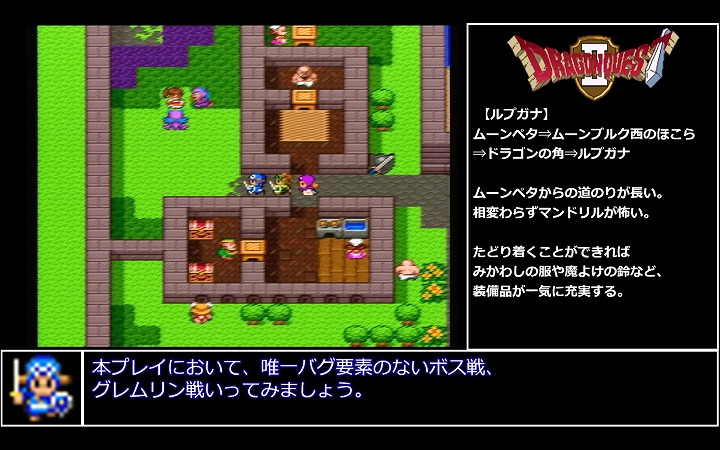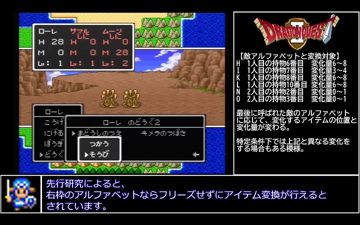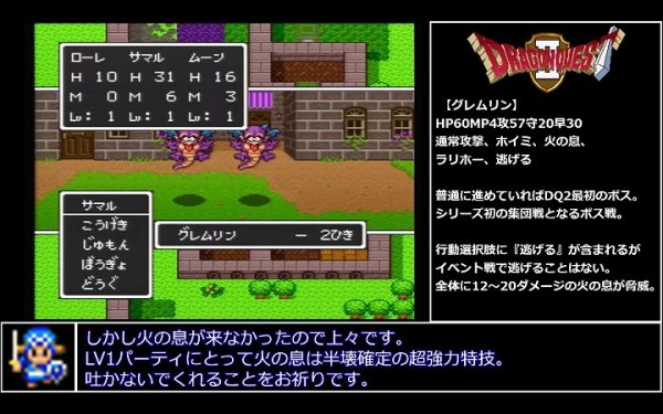 極限低レベルを目指す本プレイではバグのない序盤のボスもLv1パーティでの突破が目標ということで、経験値の分配も考慮した低レベルプレイらしい攻略も披露されていた。