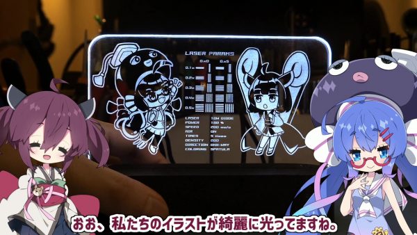 レーザー彫刻機で「光るアクリル彫刻」を作ってみた! 東北きりたんと音街ウナのイラストがくっきり鮮やかに浮かび上がる