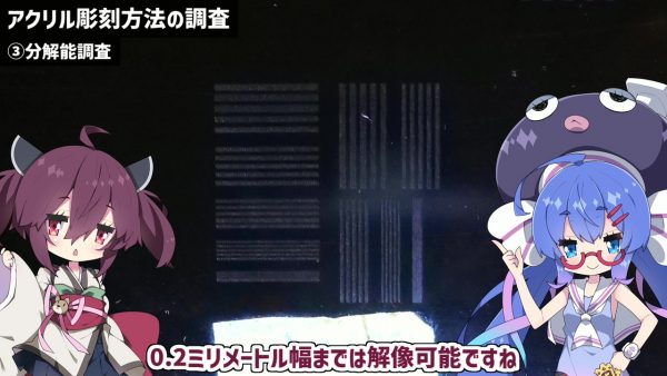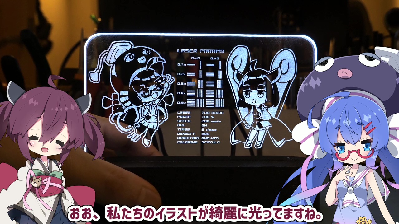 レーザー彫刻機を使って「光るアクリル彫刻」を作ってみたとの動画が投稿されています。音街ウナと東北きりたんのイラストが、透明なアクリル板の上で白く光ります。