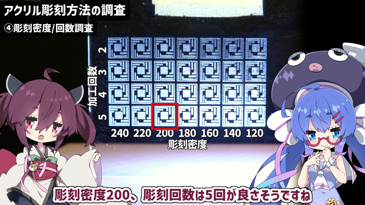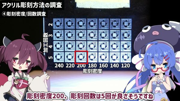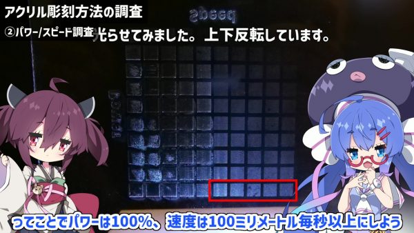 次に、レーザーのパワーとスピードの調査を行います。パラメーターを変えたマトリクスを作り、実際に彫刻します。スピードを遅くしすぎるとアクリルが溶けてしまい、絵の具が染み込んでしまいました。結局、パワーは100%、速度は100mm/秒以上に設定することにしました。