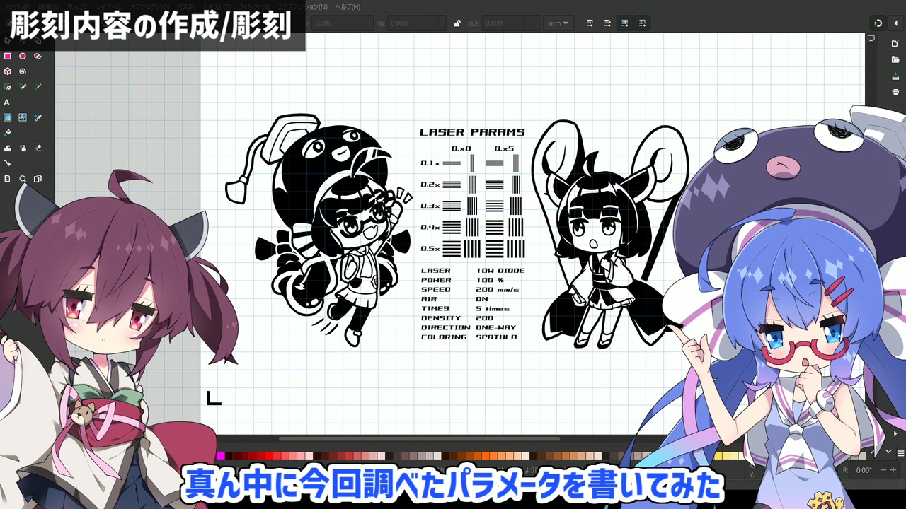 線幅0.2ミリ以上を意識しつつ、音街ウナと東北きりたんのイラストを描いていきます。二人の間には、今回調べたパラメーターをデザイン。後から見てすぐに分かるので、彫刻機の近くに置いておけば今後も便利に使えそうです。