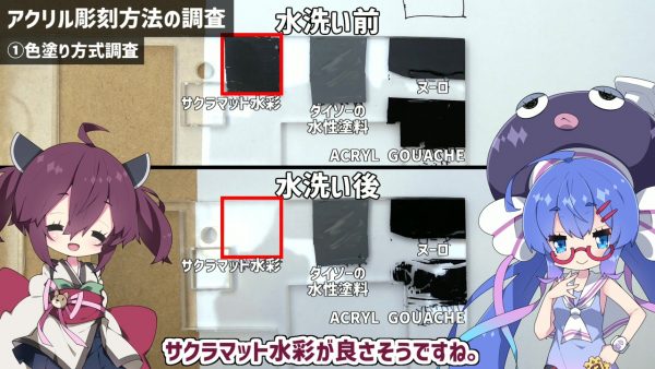 まずはアクリル板に色を付けていきます。可視光のダイオードレーザーを使うので、何もしないとそのまま光が透過してしまいます。そこで、さまざまな画材を試したところ、使い勝手が良さそうだったのが「サクラマット水彩」。水洗いだけで簡単に落とすことができました。