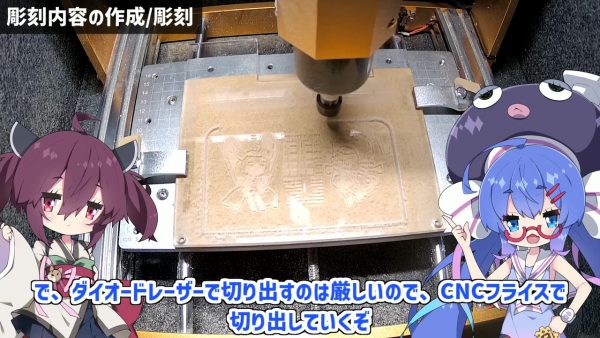 いよいよ本番、イラストの彫刻です。作業時間は3時間15分ほどかかりました。CNCフライスを使って、外周を切り出します。