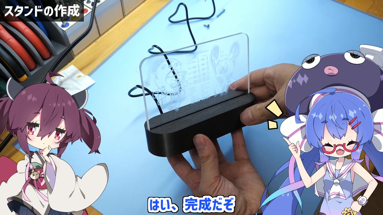 スタンドも自作していきます。LEDをつけるための回路を設計し、CNCフライスで削り出して配線を半田付け。筐体は3Dプリンターで制作しました。組み立ててアクリル板をセットしたら、ついに完成です。