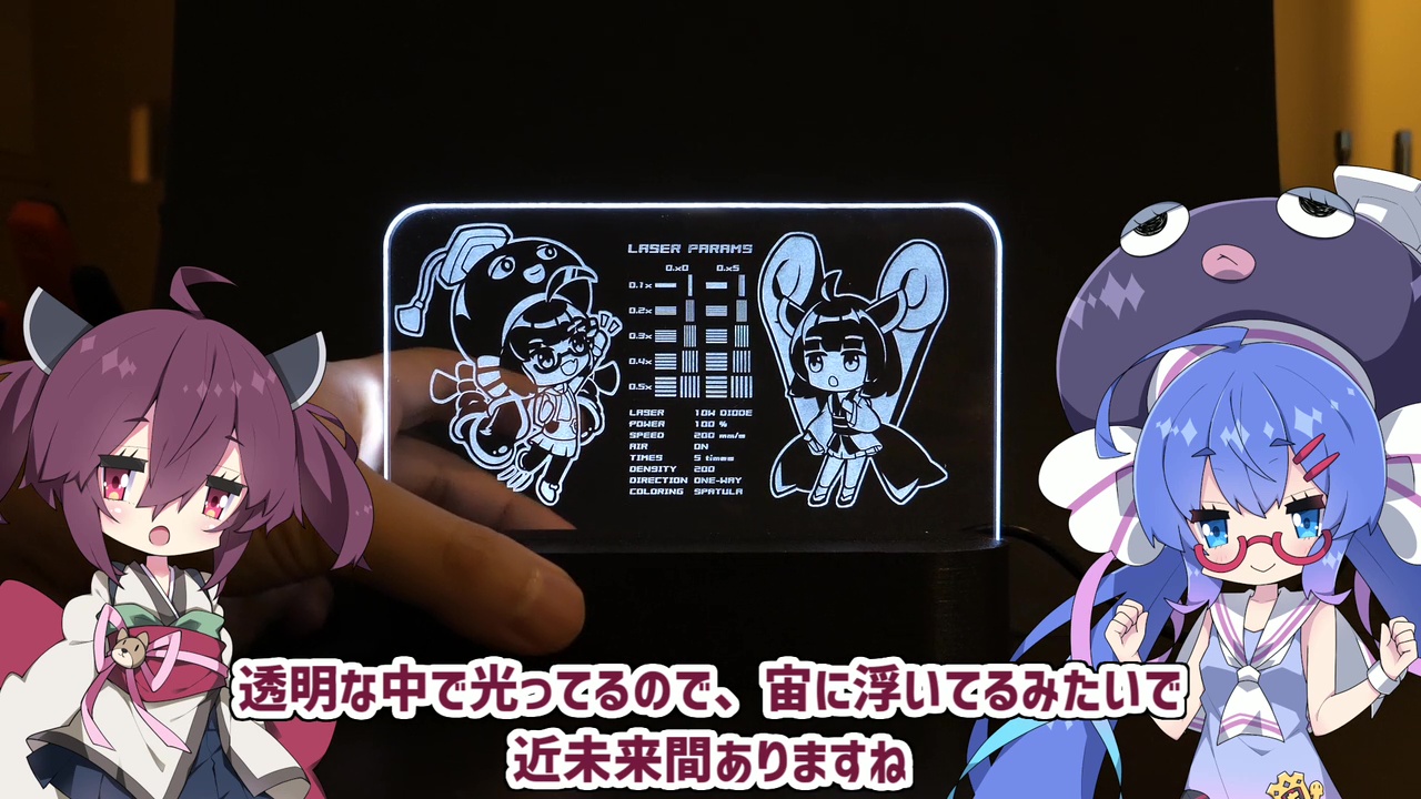 レーザー彫刻機で「光るアクリル彫刻」を作ってみた! 東北きりたんと音街ウナのイラストがくっきり鮮やかに浮かび上がる