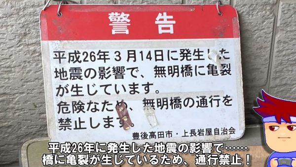 ここで目的の橋は平成26年の地震の影響で通行禁止になっていることが判明。現在はどんな状態なのでしょうか。