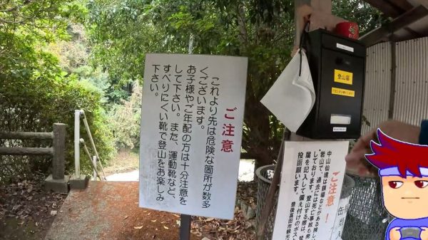 登山口へ着くと大きな注意看板がお出迎え。十分にご注意くださいの言葉に迫力があります。