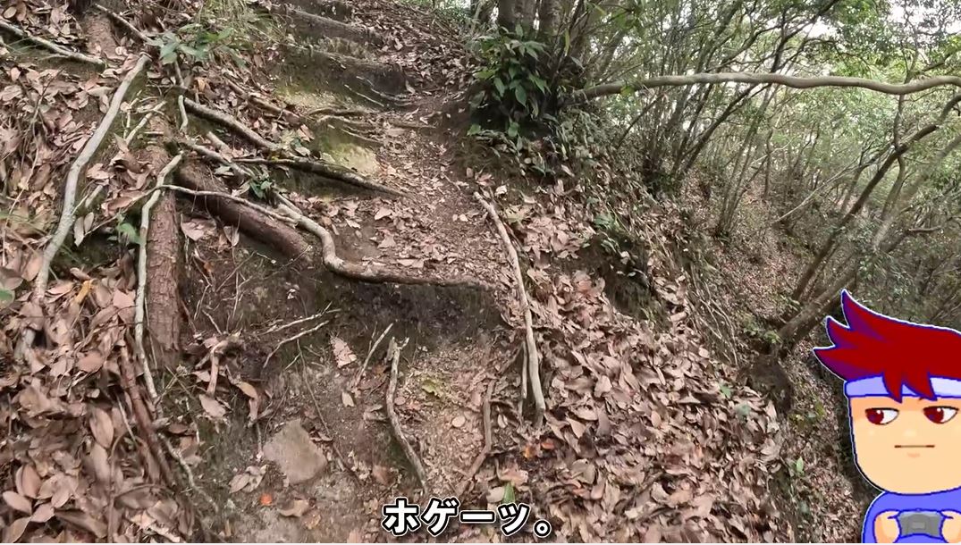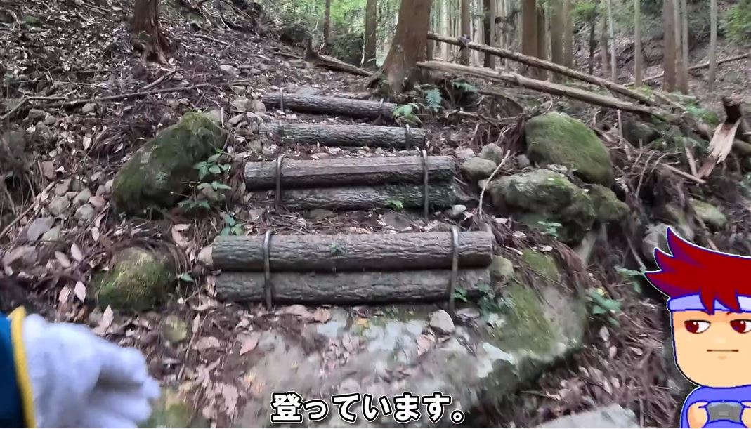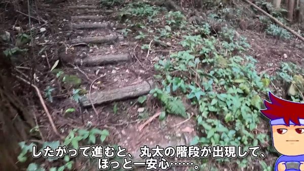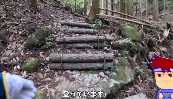 歩いた先に丸太の階段が出現してホッと一安心のウスイさん。