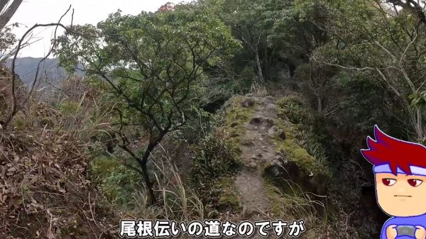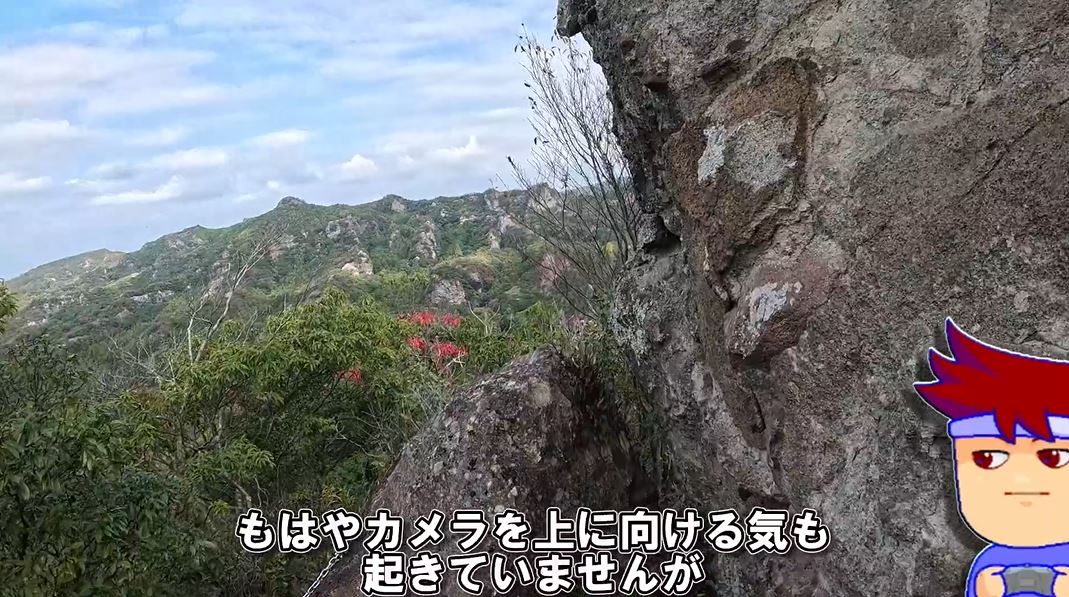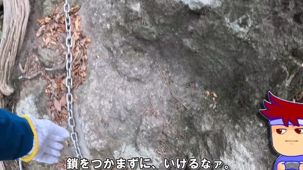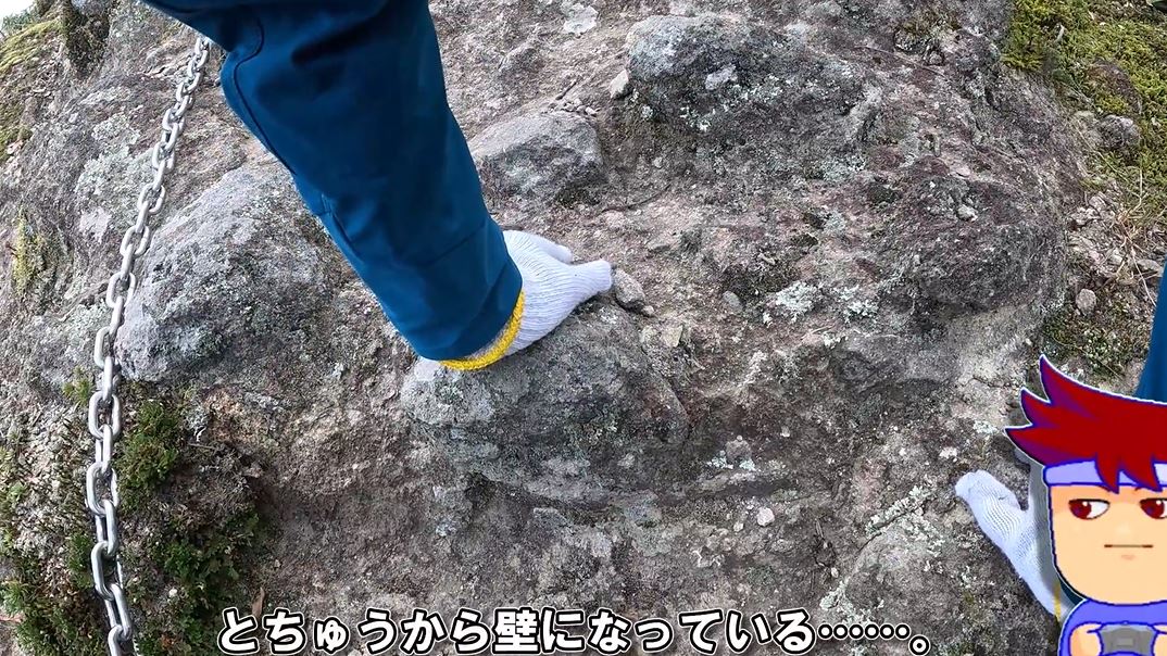 これまでと違い迷いようがない尾根を歩いていると、鎖につかまって登るような岩場がやって来ました。