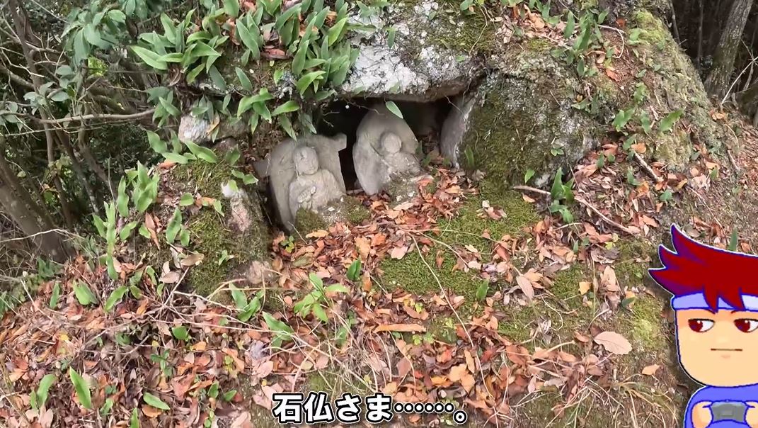 さらに山道を行くと石仏が2体。ウスイさんはしゃがんで手を合わせてから進みます。